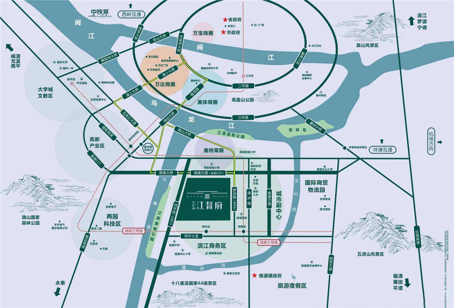 自然景观与交通 项目周边自然环境优越,大樟溪、乌龙江两江环绕,滨江湿地公园、旗山国家森林公园等自然景观为居住者提供了清新的空气与宜人的居住环境。四横五纵的路网设计,使得项目能够快速通达福州市中心、滨海新城、火车南站及长乐国际机场等重要交通枢纽,出行便捷无忧。