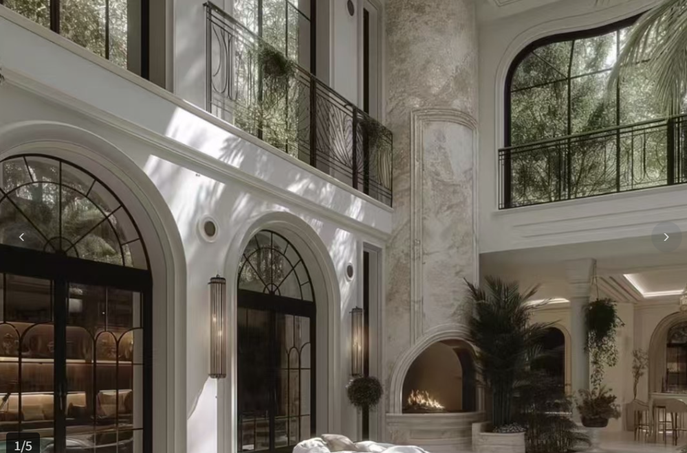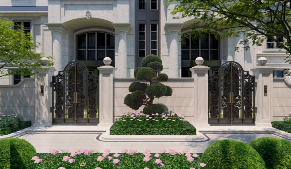 社区大门打造了近50米法式门庭,中央是定制水景,两侧矗立着5.5米高的整石立柱。