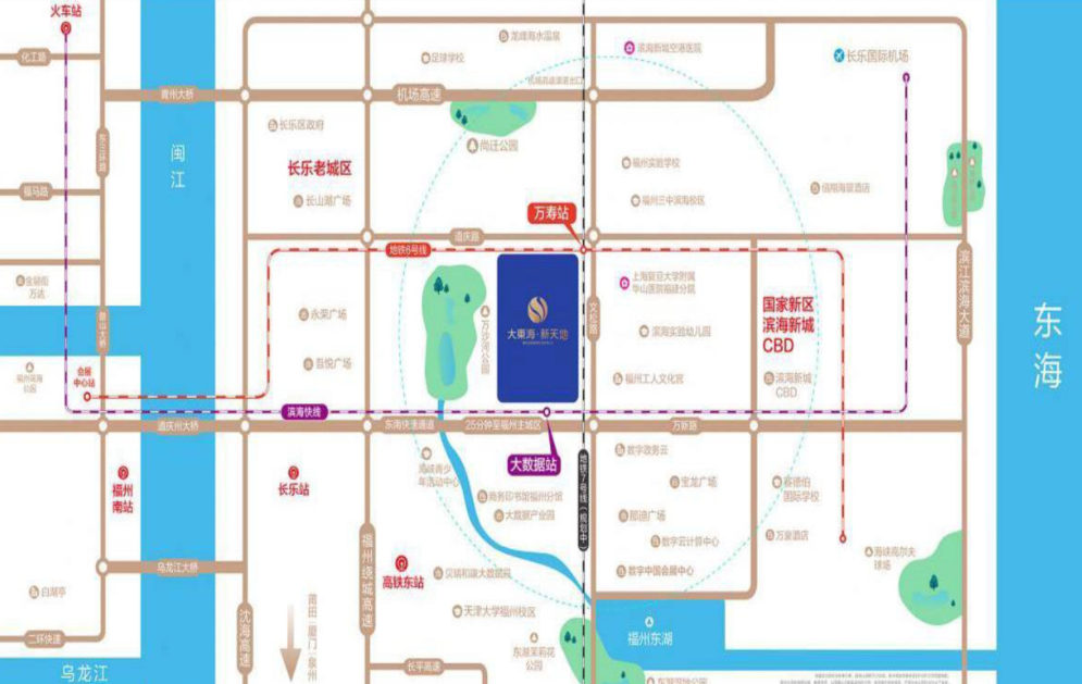 大东海新天地位于福州长乐滨海新城CBD核心区,隶属于文武砂街道,是福州“东进南下”战略的核心区域。项目总建筑面积约45万㎡,规划有16栋高层住宅,定位为刚需兼改善型社区。