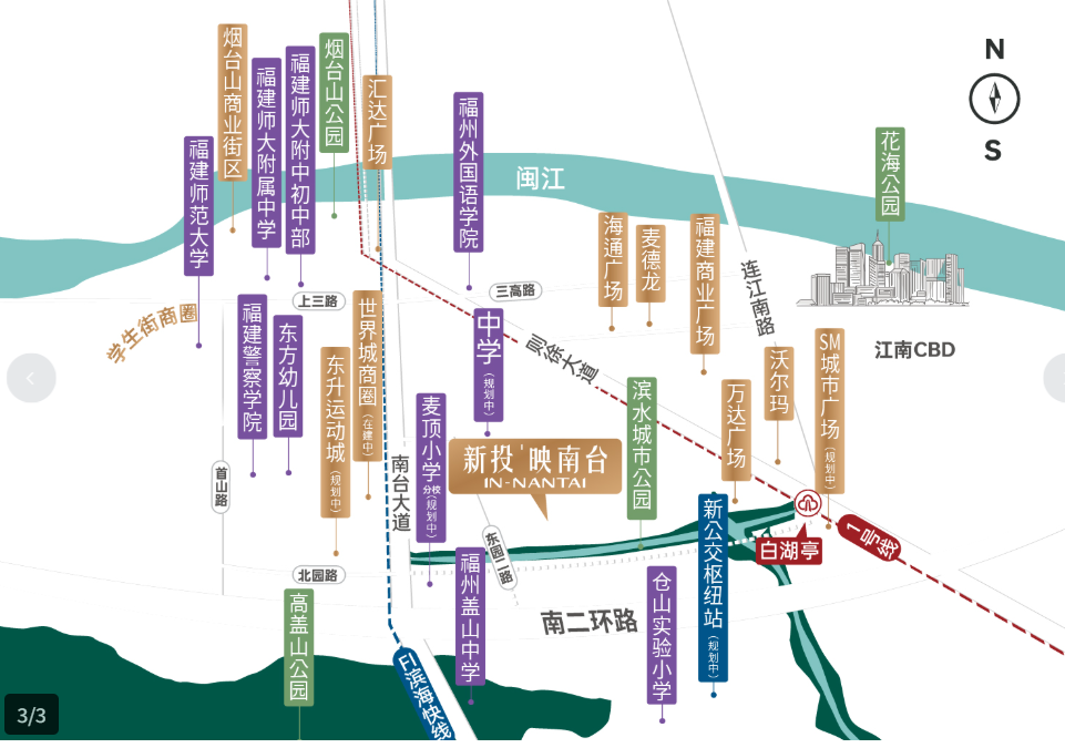 新投映南台位于福州市仓山区盖山镇,属于福州“南进”战略区域——三江口板块的延伸辐射带。