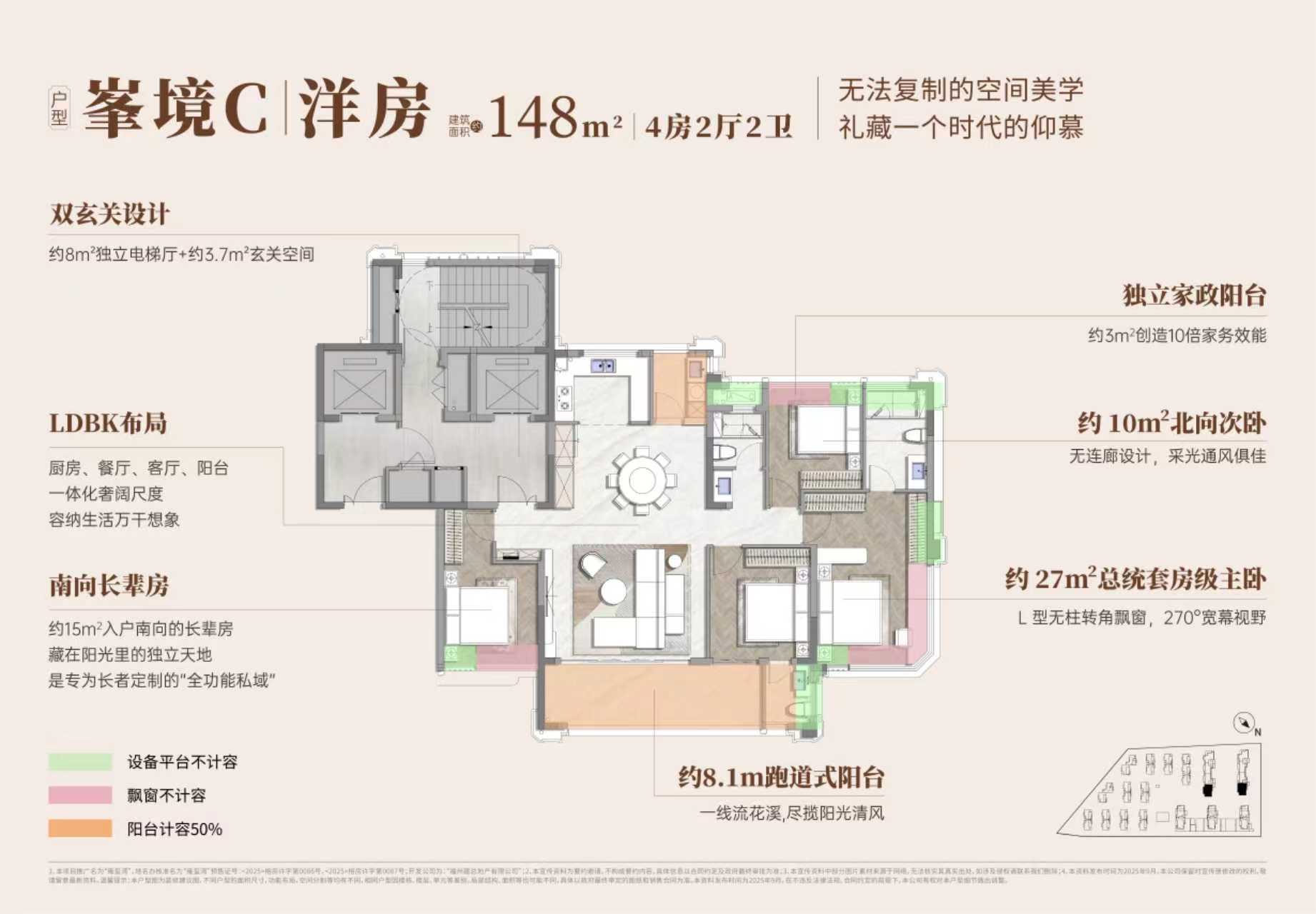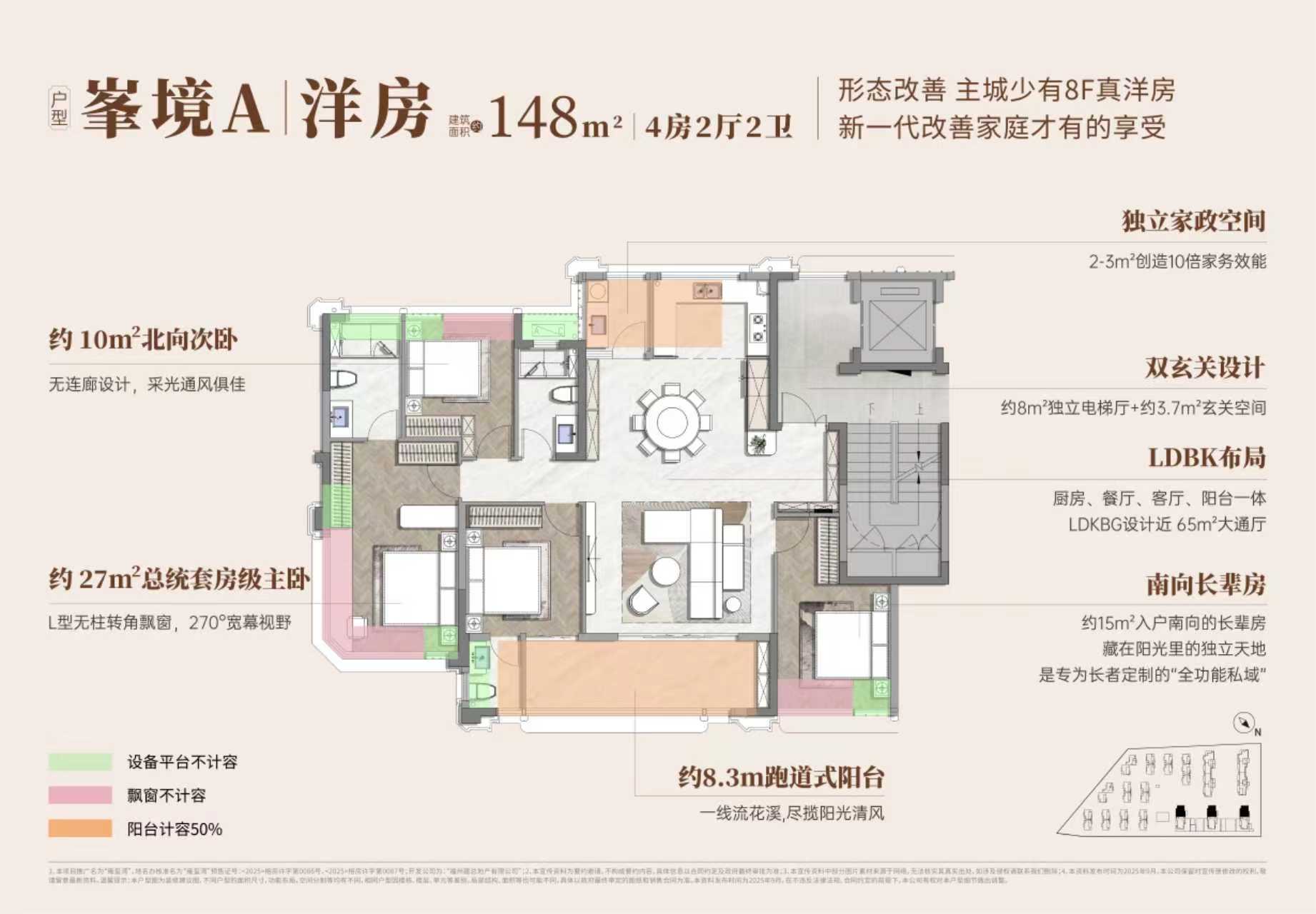 5栋8F-14F小高层住宅产品面积段覆盖洋房、小高层128㎡四房/34套、148-149㎡四房/34套,以及267-270㎡联排/23套。