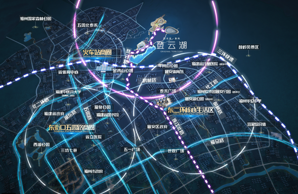项目位于晋安区登云板块,快速连接东二环,距离福州站直线距离仅1.8km,前往福州传统市中心(如鼓楼、台江)车程通常在30-40分钟以上。