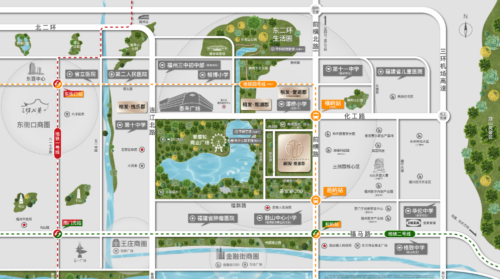 商业配套方面,榕发·揽湖郡周边聚集了四大商圈:东二环泰禾广场、爱摩轮商业广场、宜家商圈和世欧广场。