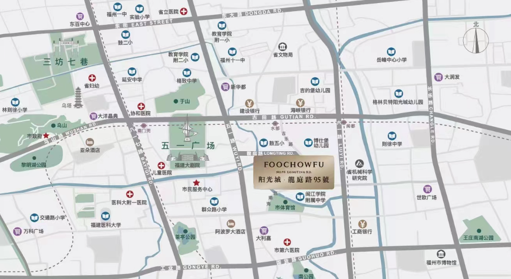 在福州地产界,龙庭路95号的地理位置堪称绝版资源。项目位于鼓楼区五一中路旁,海潮路与古乐路交汇处,地处福州传统意义上的“心脏”地带。