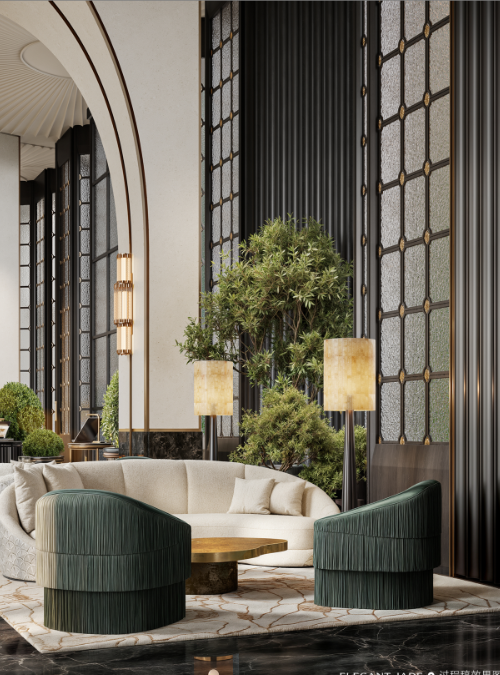 项目首创“金冠凤首”流线型立面及鎏金天幕立面,复刻香格里拉酒店的鎏金光影,让建筑成为流动的艺术馆。