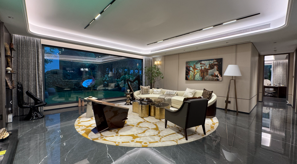 通过“一环两轴七境”的沉浸式景观布局,将星级度假园林嵌入社区。约460㎡下沉式庭院以流景水院雅韵,融人文于自然肌理。