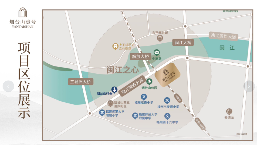 烟台山壹号坐落于福州市仓山区南江滨西大道26-3号,位于福州北起屏山镇海楼、南至烟台山的历史中轴线上。