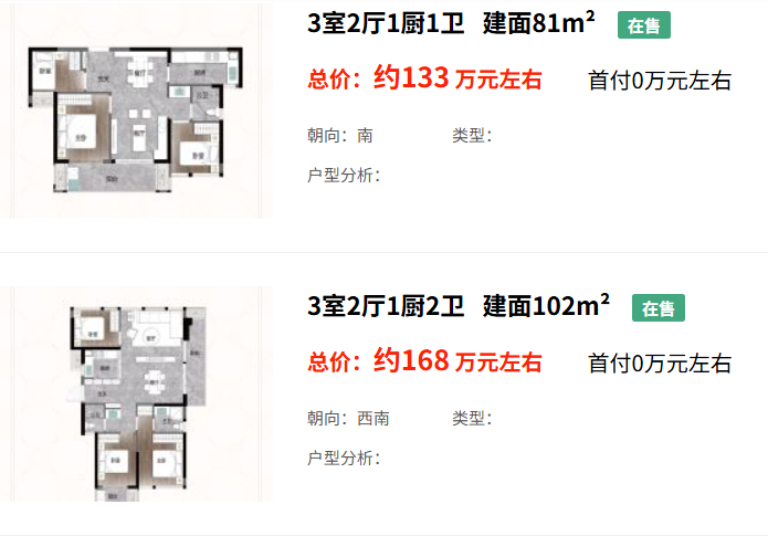 约81㎡三房:极致压缩面积,控制总价,满足新婚夫妇或三口之家最基本的功能性住房需求。