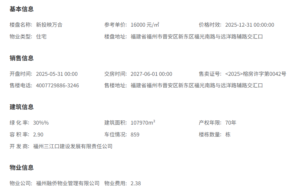 新投映万合当前参考均价为16000-17000元/平方米,这一价格明显低于福州主城区均价,相较于周边同类型新房具有显著价格优势。
