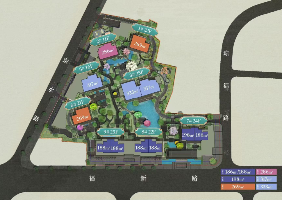 户型特色:所有户型均做到大面宽、双入户、高私密性;269-333㎡产品更配置了独立温泉房,含淋浴区、泡池区、干蒸区,将福州的“福城温汤”文化引入家中。 精装品质:国际一线的匠心细节