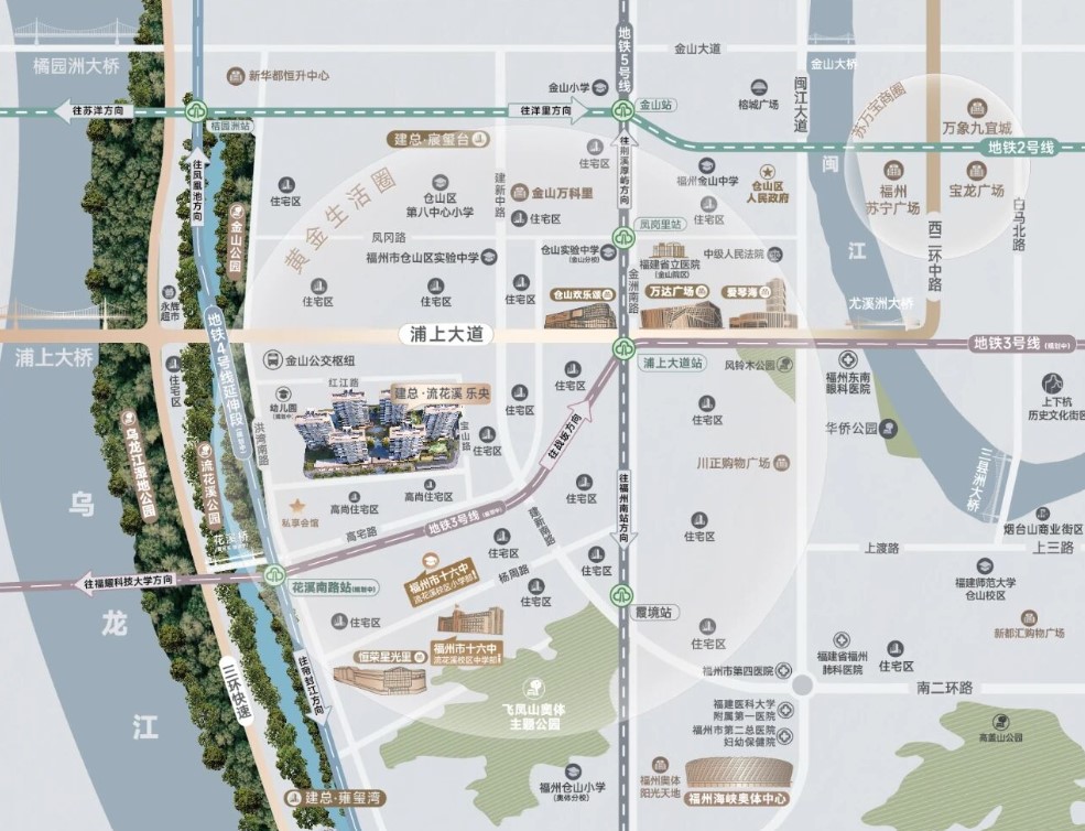 区位优势是项目的一大亮点:项目位于浦上大道流花溪畔,临近金山浦上大道核心商业区,生态资源优越,兼具流花溪与乌龙江双景观。周边商业、教育(十六中流花溪分校)、医疗(省立医院金山院区)等配套成熟,并且有地铁5号线(现有)和3号线(规划中)的交通利好。