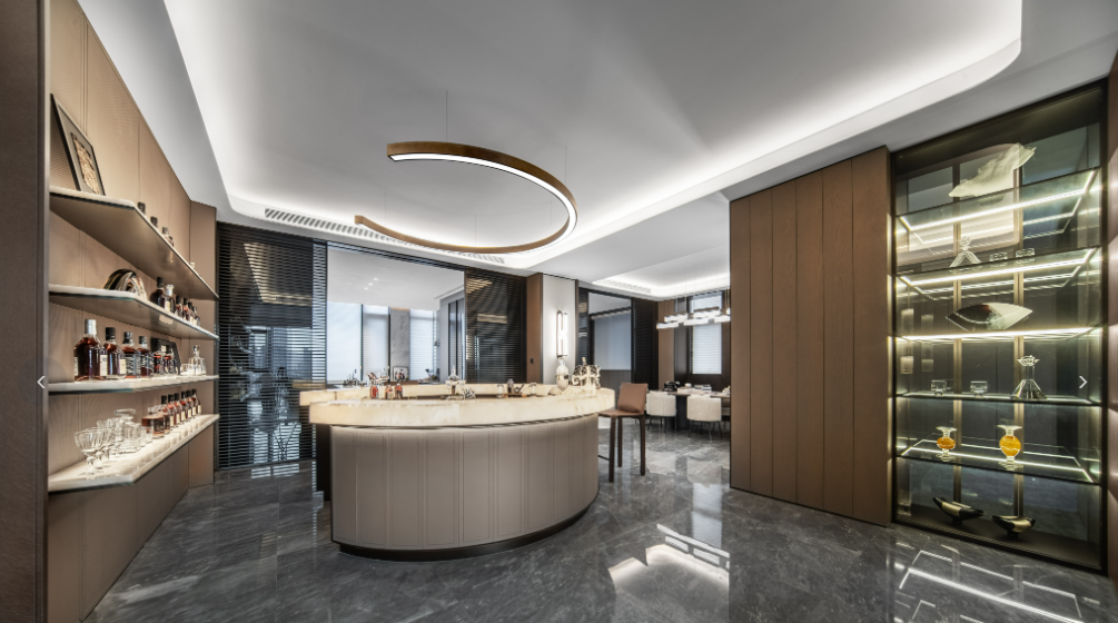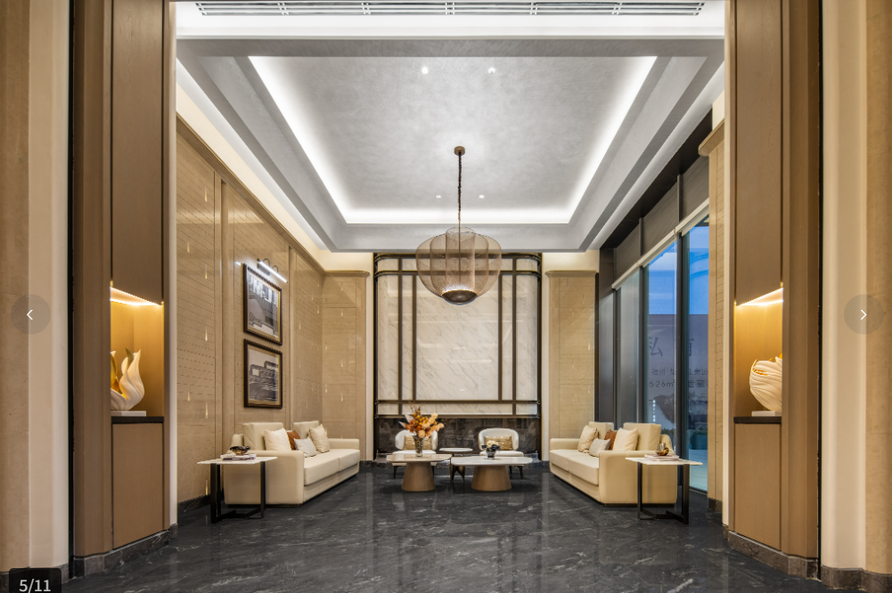 设计方面,项目大堂整体布局沿着中轴展开,形成严谨的对称关系,地面采用深色奢石与复古金属线条交织,营造庄重而不失温润的归家氛围。