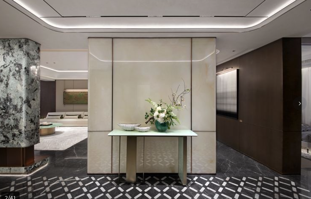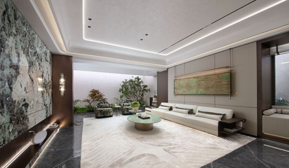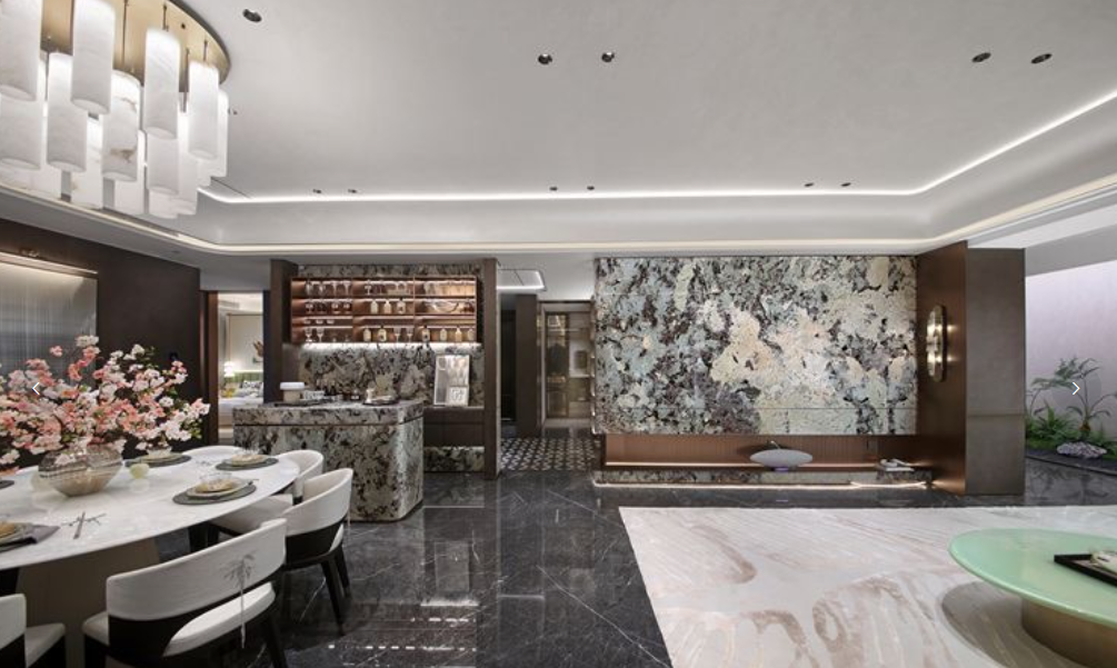 入口大门甄选昂贵的马达加斯加蓝翡翠奢石,镶嵌宫廷御用藻井片,尽显尊崇礼序;中央水景则以整块奢石精琢成巨大玉璧,寓意“四方来财,海纳百川”。