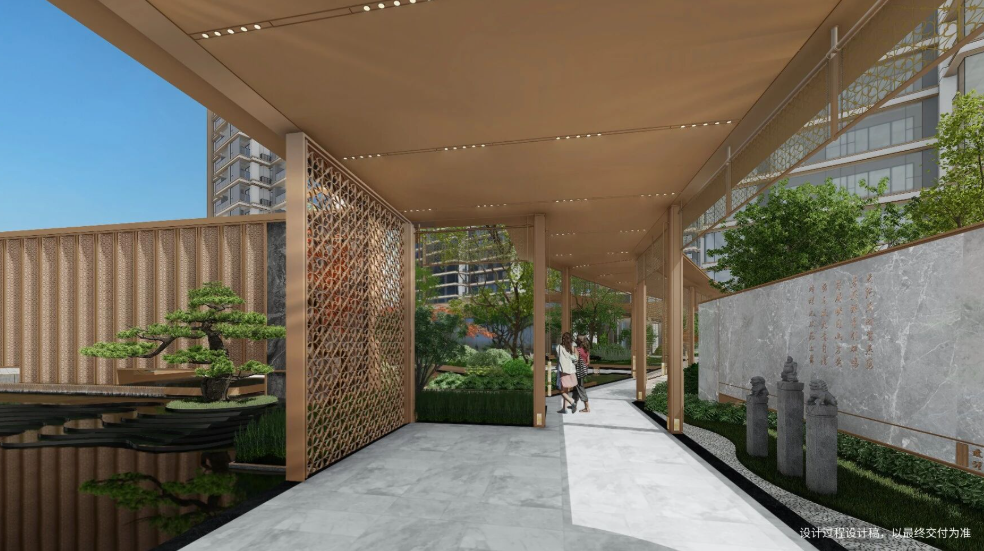 项目入口设计大气,采用五星级酒店式大门,宽度约50米,高约7米,两侧配置罗汉松和红果冬青,营造归家仪式感。大门前还设计有水系,结合传统文化中“风管人丁水管财”的理念,打造四水归堂的景观效果。