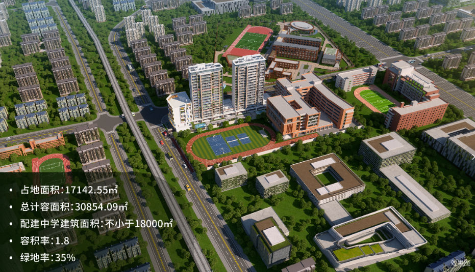 学府壹号占地17142.55平方米,总计容建筑面积30854.09平方米。项目规划建设2栋高层住宅楼,仅136套房源,这种小体量社区设计有助于建立更和谐的邻里关系。