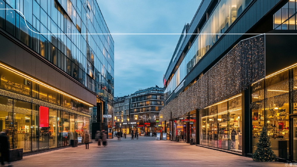 项目采用现代摩登风格建筑外观,香槟色金属线条与通透天幕玻璃立面结合,打造时尚而具质感的外观形象。
