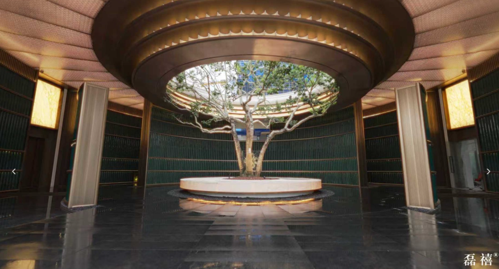 约90米超尺度门庭采用迪拜帆船酒店同款的贝金米黄奢石立面,中央设置“茉心云环”三层环形皇家白玉石纯手工镶嵌装置。