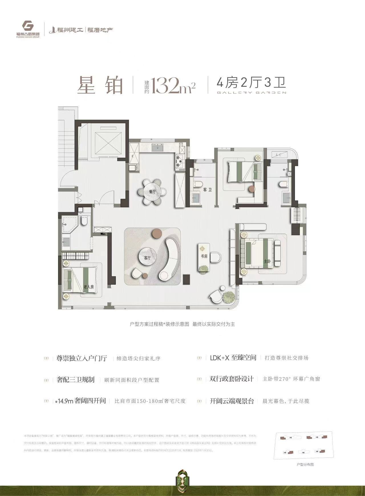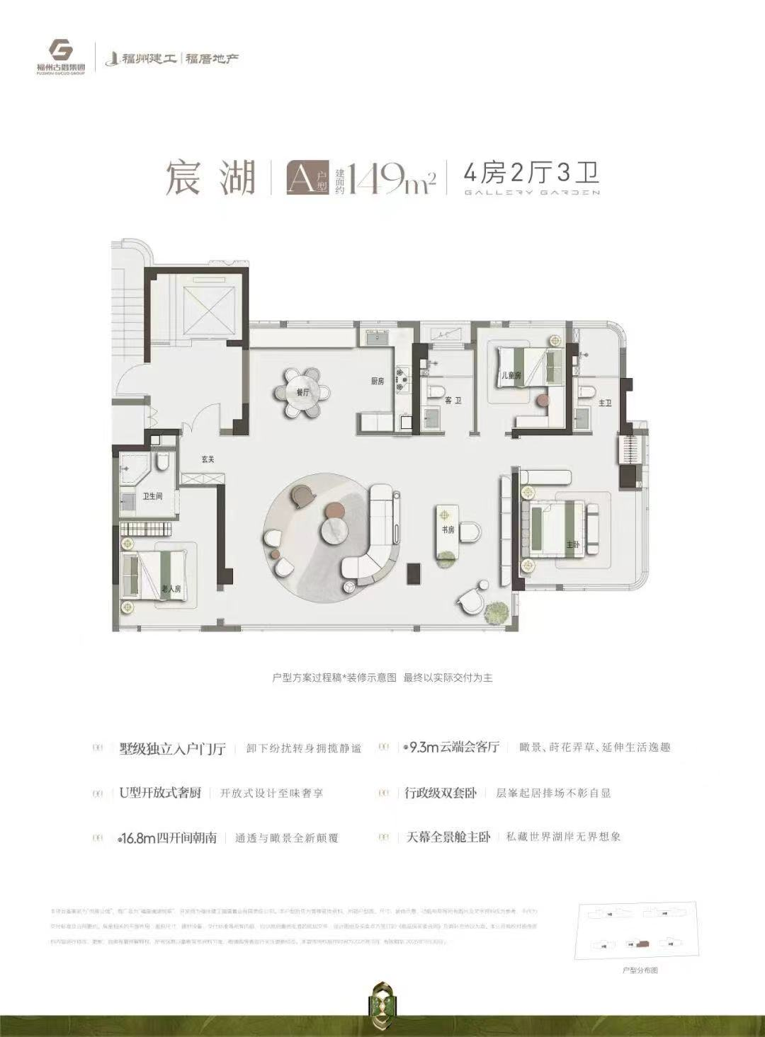 福厝·澜湖悦宸的户型定位非常明确,主打建面约119至149平方米的全四房产品,全部采用一梯一户设计,保障了住户的私密性和尊崇感。项目的户型设计有几大亮点:第一,全系户型层高达到了3.05米,比市面上常规的2.9米高出近15厘米,显著提升了室内的空间开阔感和采光通风效果。第二,项目宣称得房率高达95%至98%,这意味着购买119平方米的户型,实际享受的空间感相当于其他楼盘130多平方米的水平。第三,132平方米和149平方米的户型规划了双套房或三卫设计,尤其适合多代同堂的家庭居住。户型设计强调南北通透、多开间朝南,兼顾了实用性与舒适性。