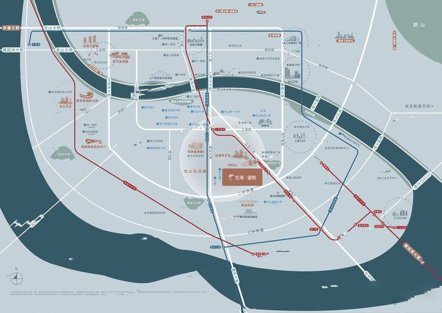 左海望悦坐落于福建省福州市的则徐大道,位于南二环和该市主要桥梁之一尤溪洲大桥的交汇处,成为城市发展的中心。尤溪洲大桥宛如一道绚丽的彩虹飞架在闽江上方,将左海望悦与仓山万达商圈连接起来,让人只需稍作行驶即可享受到繁华商业区的热闹氛围。而鼓山大桥则可将人直接带到距离五公里的金融街CBD,让繁忙都市的喧嚣在眨眼间成为过往云烟。 在城市配套设施方面,左海望悦犹如闪耀的明星,四周环绕着白湖亭万达广场、中骏世界城(正在建设中)以及SM广场(正在建设中)等三个大型综合商业体。福建商业广场、海通广场、麦德龙等商业配套创建了一个百万级商圈,让人们能够感受到城市的活力脉搏。教育是每个家庭的重要关注点,而左海望悦所处的仓山文教区拥有丰富的教育资源。项目周围规划了幼儿园、中小学,高湖小学、仓山实验小学(郭宅分校)等学校仅步行一公里即可到达,而附近还有外国语学校、麦顶小学、仓山小学、福州高级中学、福建师范大学附属中学等知名学府。