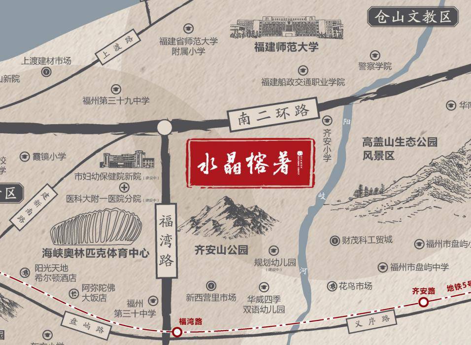 【休闲配套】水晶榕著周边环绕着三大公园,占据了福州稀缺的生态资源。包括飞凤山奥体公园、高盖山生态公园和齐安山休闲公园,让居民可以享受丰富的休闲娱乐活动。