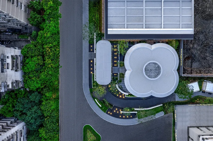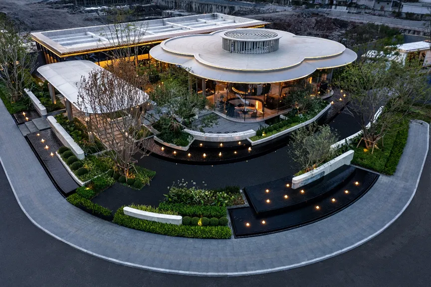 接待中心是整个项目的核心焦点,其形似“四叶草”的独特设计和花瓣状的屋面延伸,不仅吸引了人们的目光,更引导着人们前往探索。室内空间宽敞明亮,层高舒适,全玻璃幕墙立面的设计弱化了室内和室外空间的界限,实现了空间的相互交融和沟通。脉络状的结构与吊顶设计,则巧妙地将人文建筑与自然景观相呼应,营造出一种宁静而尊贵的氛围。