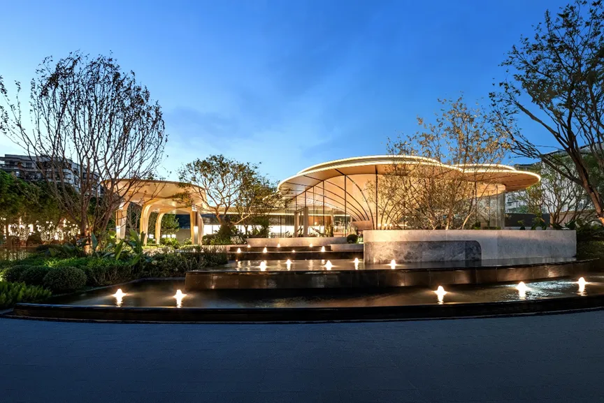 保利天悦展示区一期作为项目的入口印象,其设计独具匠心。建筑采用简洁的几何体量,材料选择上以浅色、暖色系为主,打造出了视觉通透感和高级感。前场景观的层层递进,形成了多层次的视觉体验,使人们在漫步其中时能够深切感受到人与自然的和谐共生。