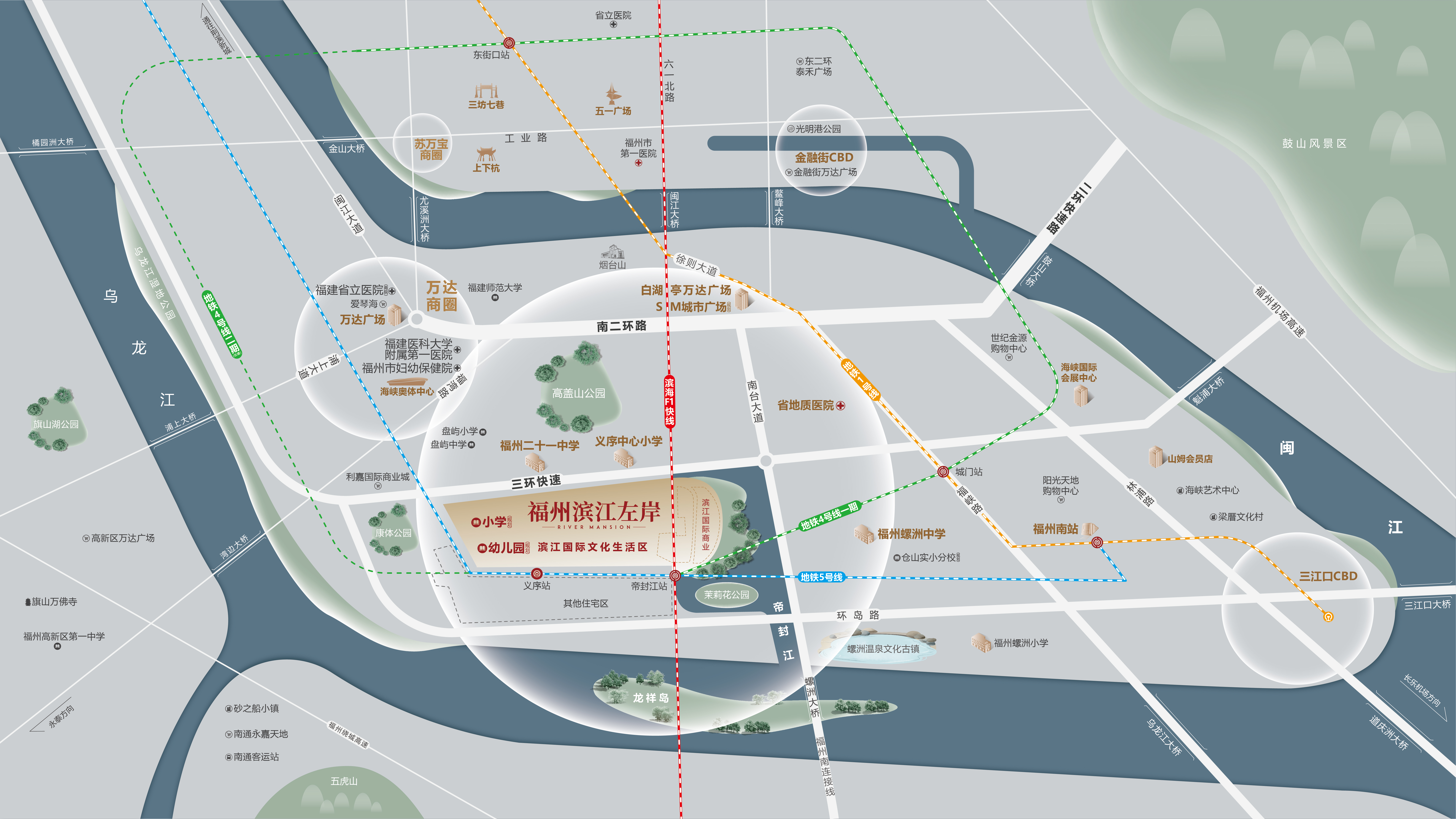 项目所在地帝封江,不仅承载着深厚的闽都文化,还是福州“东扩南进”城市发展战略的核心区域。这里的交通网络发达,拥有两横两纵的交通格局,地铁4号线、5号线以及滨海F1快线等多条线路在此交汇,使得居民可以轻松畅达福州各大繁华区域,出行成为一种享受。