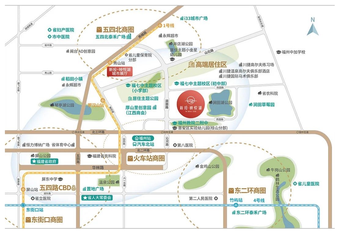四条环形路网片区,两纵三横四环的区域路网,邻近福州地铁1号线,为居民提供了便捷的出行条件。项目周边生活配套完善,3公里内约有50万方商业集群,涵盖五四北泰禾广场、133城市广场、稻田小镇等,满足居民的日常需求。以及福建省妇产医院、福州市中医院五四北分院等省级双三甲医院,为居民的健康生活提供保障。