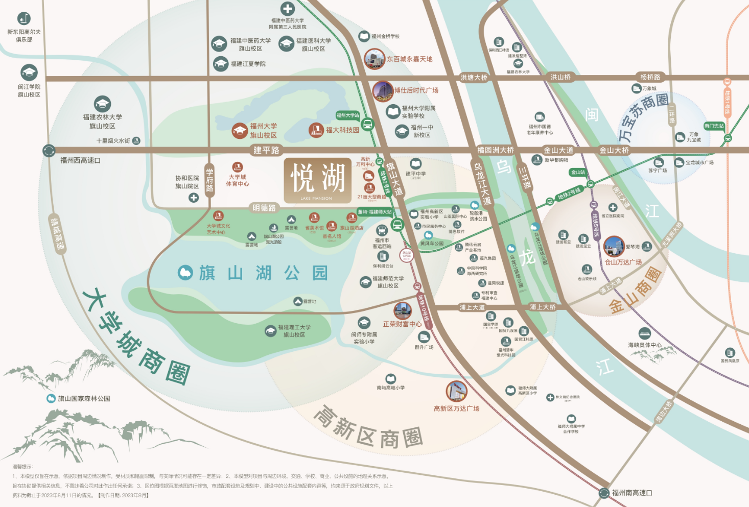 项目位于闽侯县大学城核心区域,紧邻旗山湖,地理位置得天独厚。周边交通网络发达,靠近地铁2号线董屿・福建师大站,临近规划中的地铁10号线,同时靠近客运西站、公交大学城总站、橘园洲大桥等,形成了立体交通网络,能够轻松贯通全城。