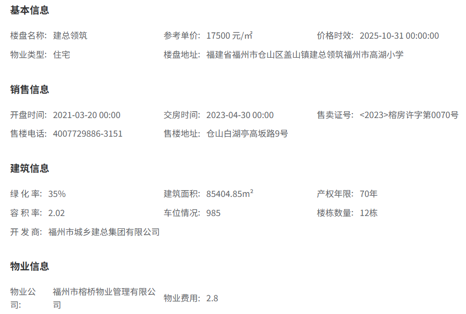 建总领筑的开发商为福州建总,是一家本土国有企业。