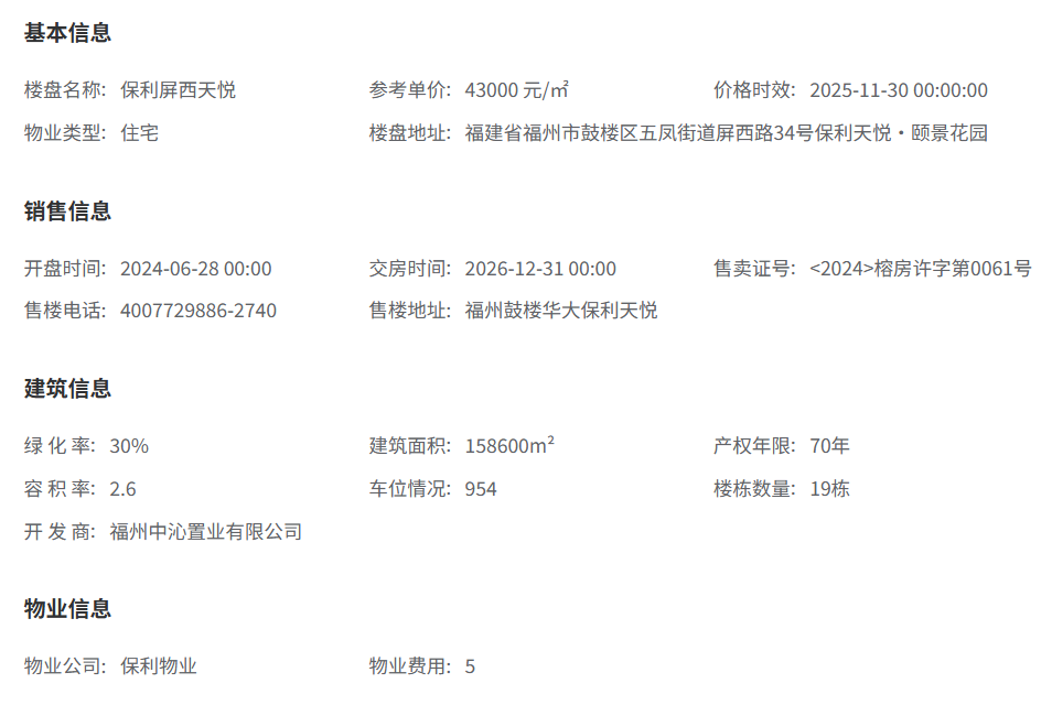 保利屏西天悦由福州中沁置业有限公司开发,品牌隶属于全国知名房企保利集团。