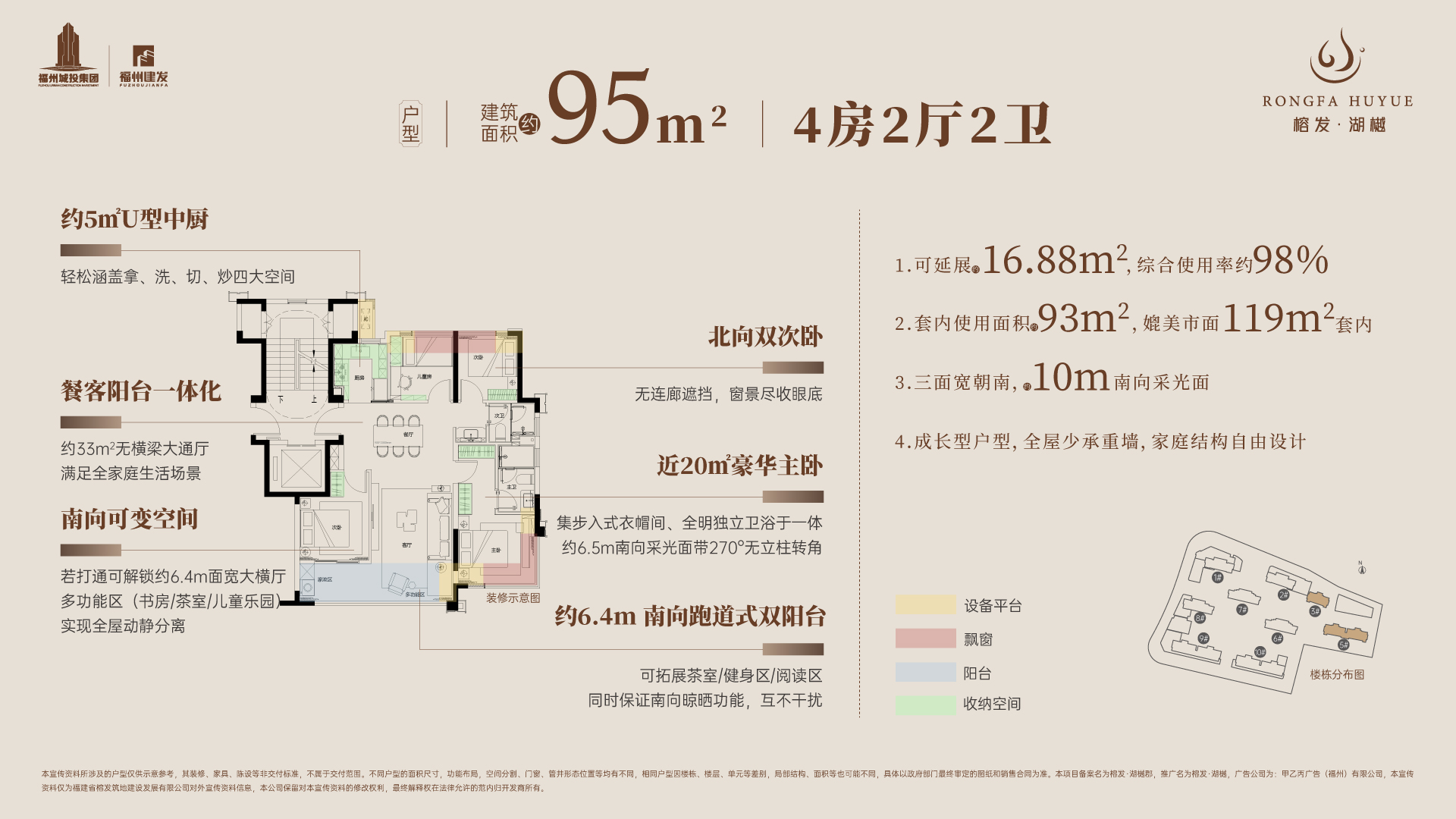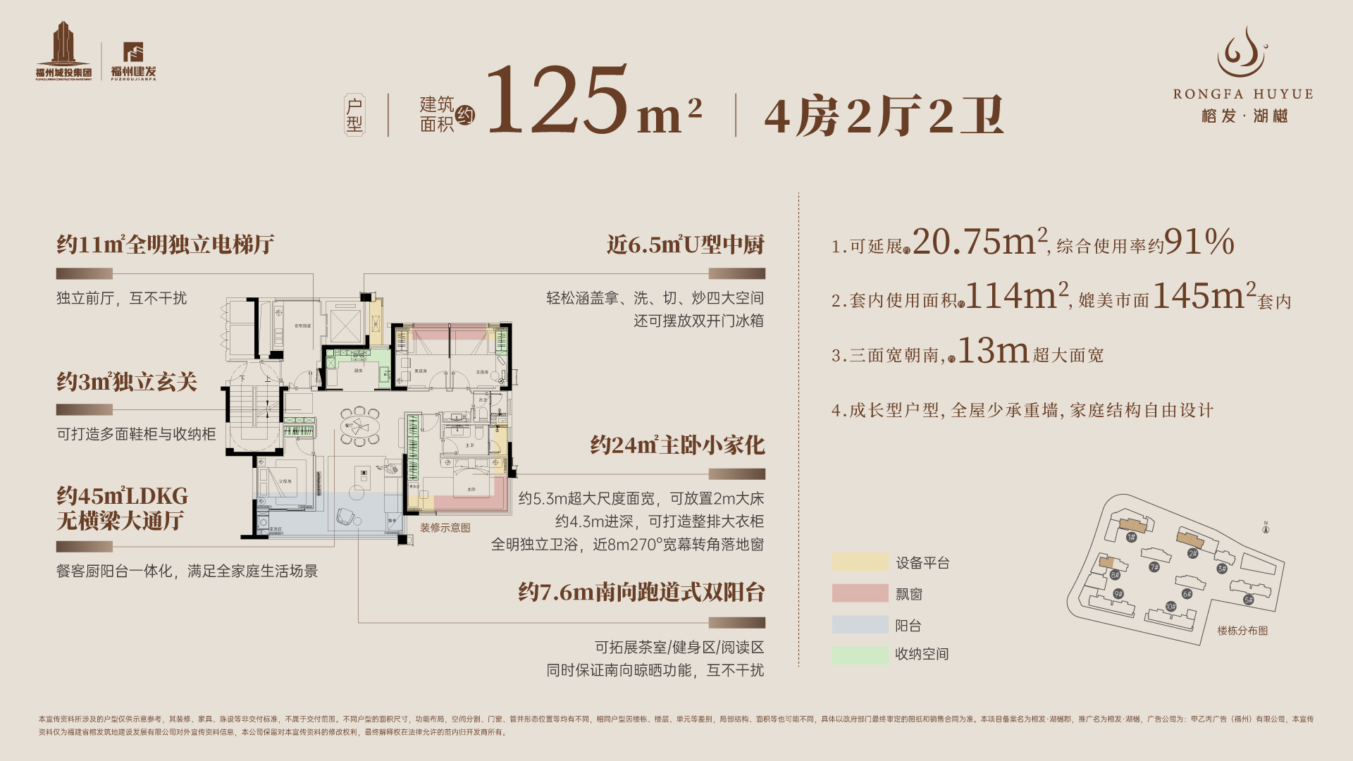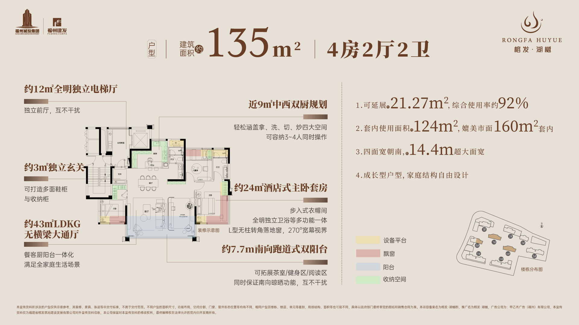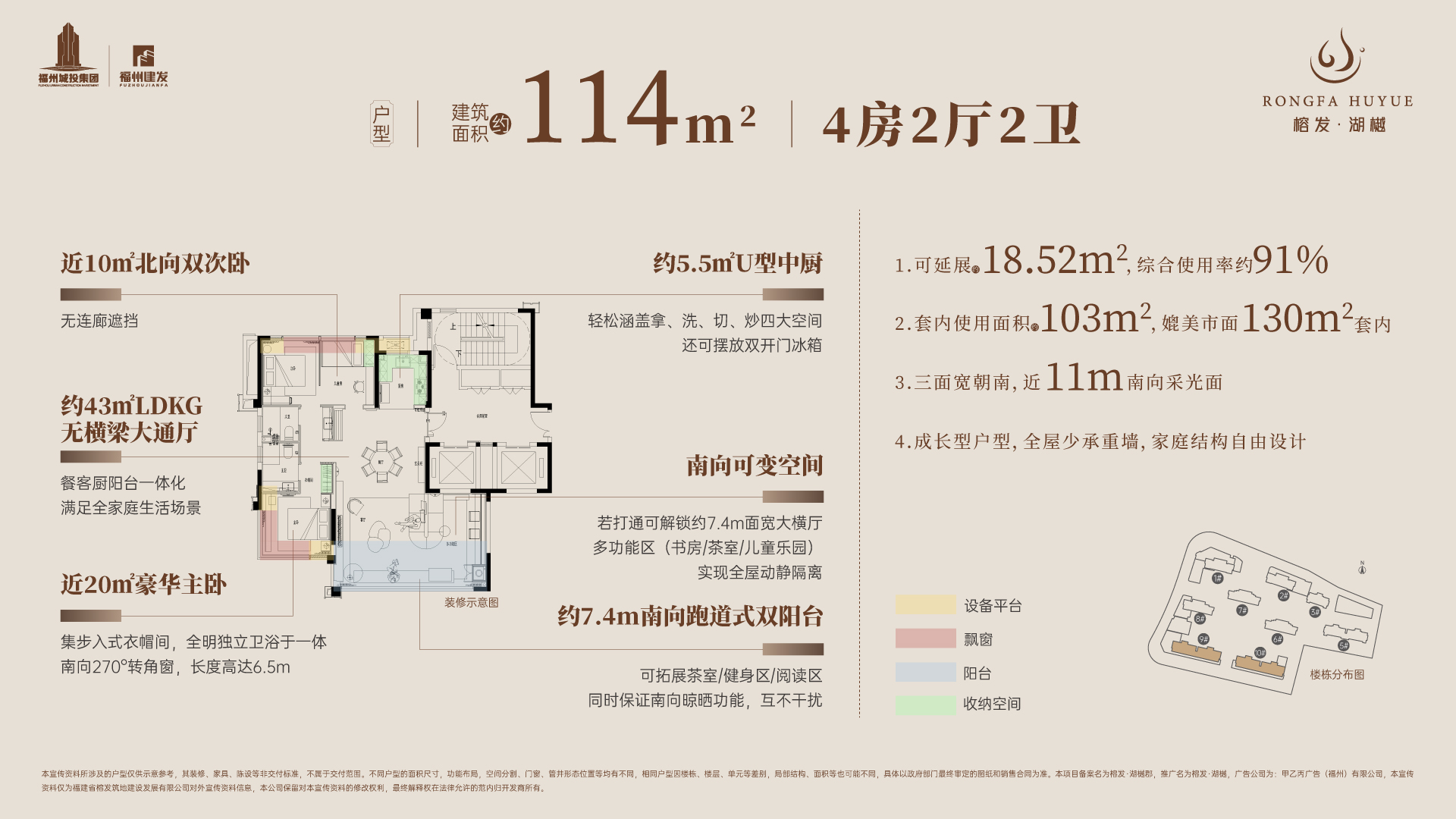 在产品设计上,榕发·湖樾定位为“新规洋房纯四房”,主打高标准配置。项目整体规划2栋1梯2户的10层洋房,以及7栋2梯2户的16-17层小高层,居住纯粹性高。