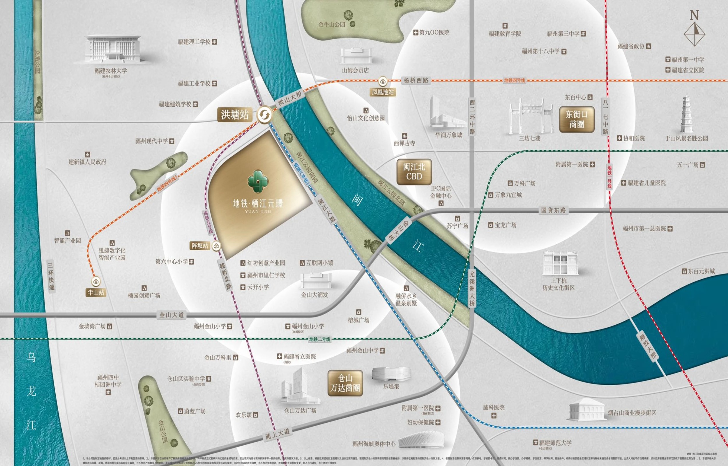 项目东侧紧邻闽江公园,步行约200米即可到达江畔,享有优质的生态休闲资源。周边还有农大沙滩公园、金山公园等生态绿地,为业主提供了丰富的自然休闲空间。这种“江园双境”的诗意栖居成为日常,让业主在享受城市便利的同时,也能拥有宁静的自然环境。