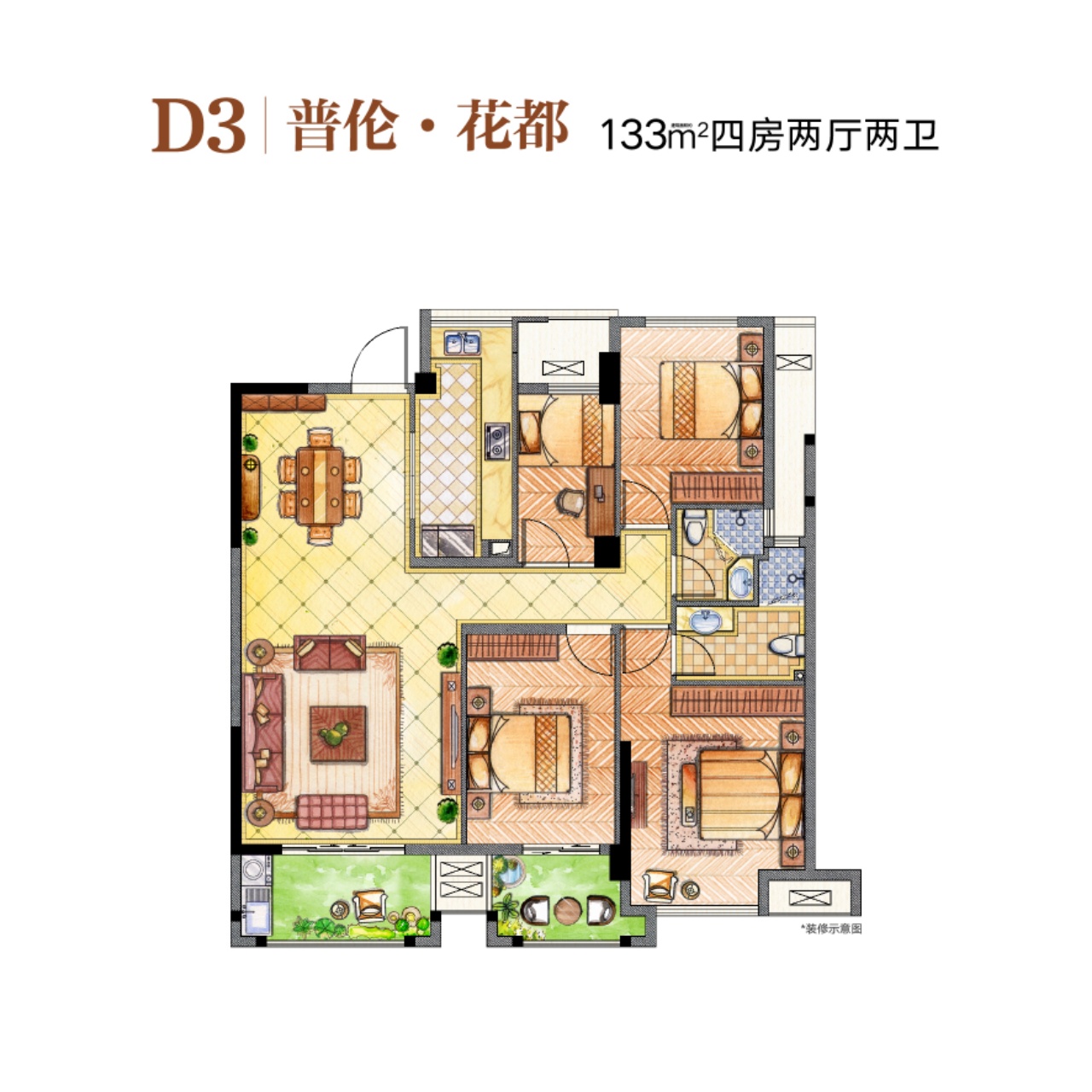 香缇时光定位为改善型住宅,产品面积段覆盖90㎡至201㎡。户型设计注重实用性与舒适性,例如有133平米的户型被设计成四室两厅两卫,并可根据业主需求进行个性化改造,如将邻近房间改为多功能室并划入主卧形成套间,体现了户型设计的灵活性。
