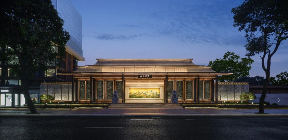 “金缕格栅” 装饰环绕建筑,长度超过百米,旨在复原宋代紫宸殿的巍峨气势。最大达11平方米的落地玻璃幕墙设计。