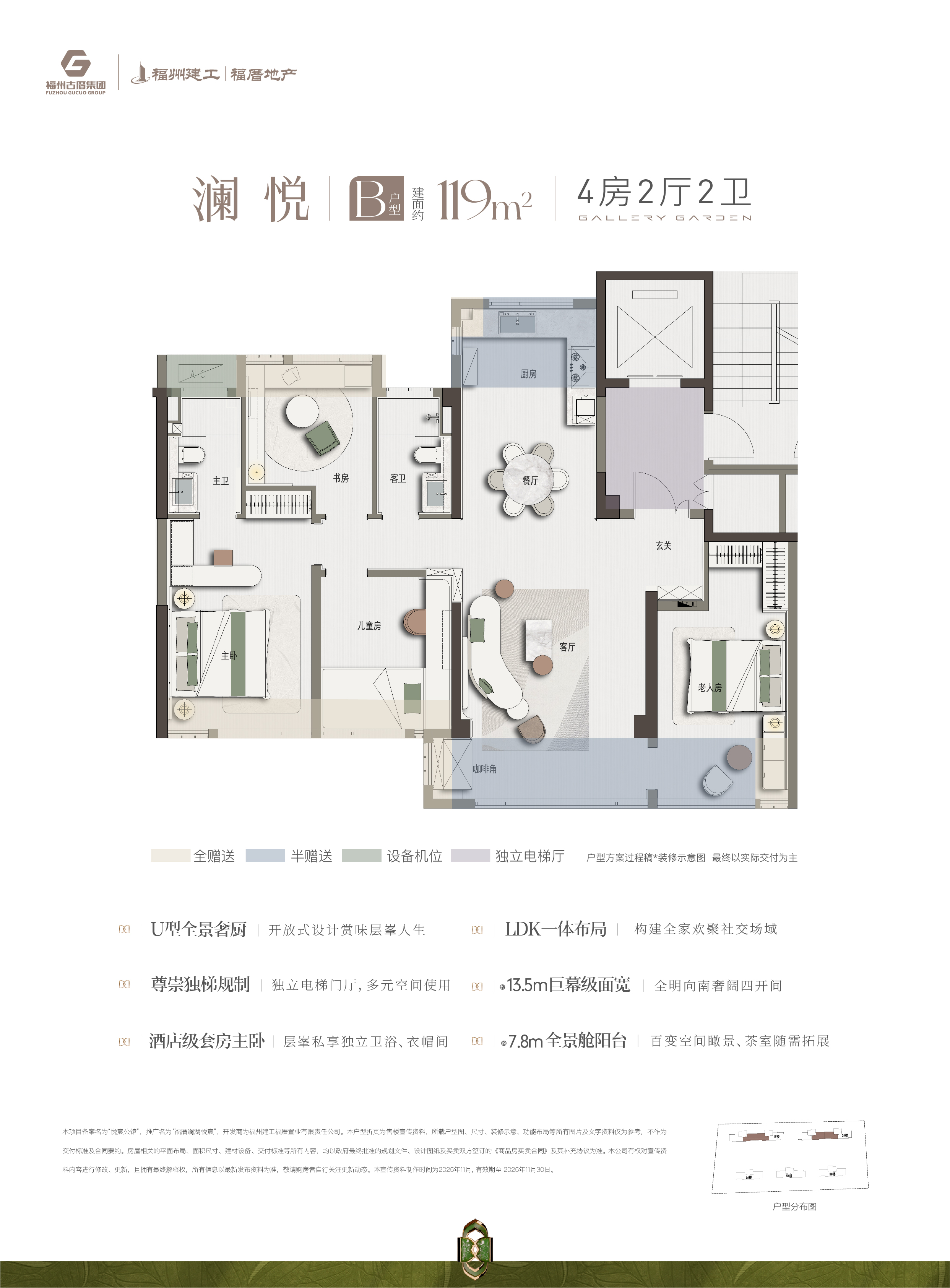在户型设计上,项目强调高得房率(约95%-98%)功能分区合理的特点。以119㎡户型为例,实现了四开间朝南,主卧配备270度观景窗,动静分区明确,兼顾了实用性与舒适性。