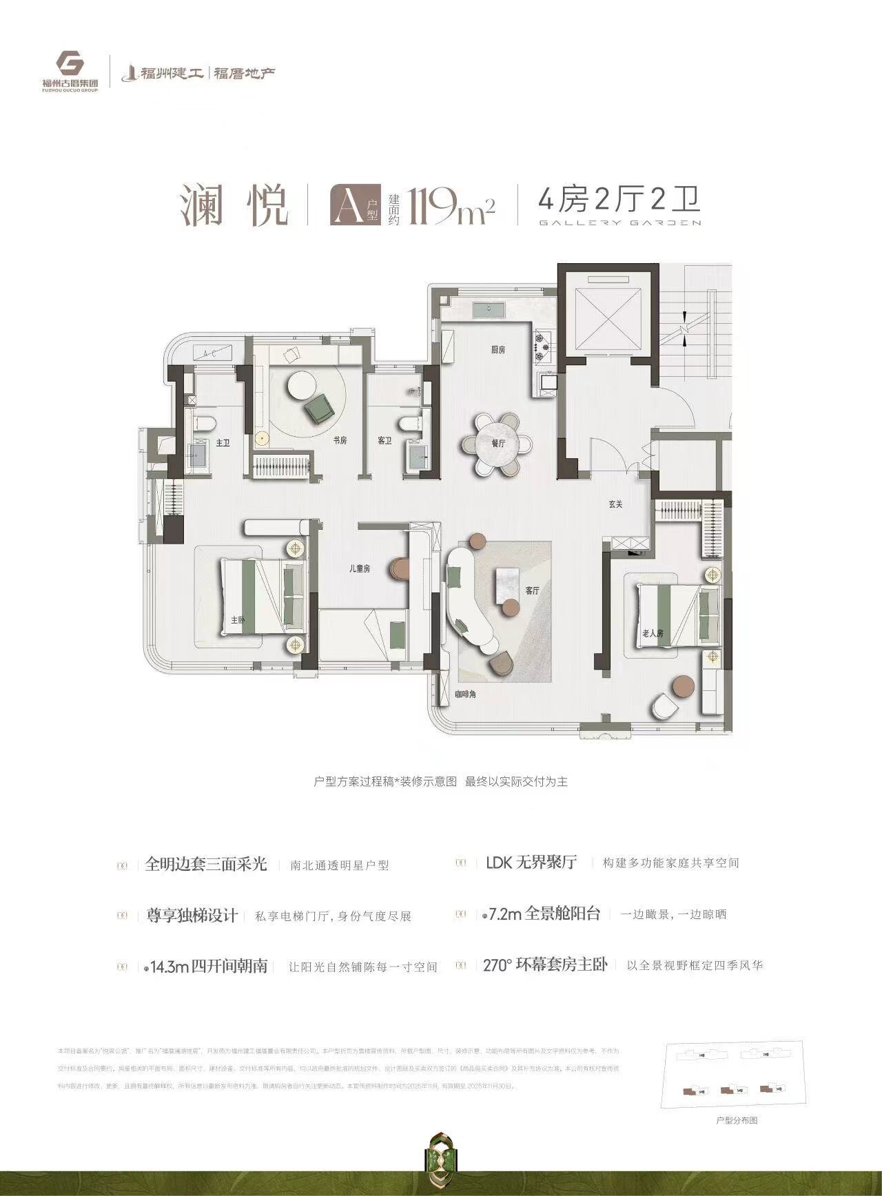 福厝·澜湖悦宸主打119-149㎡的四房户型,全部采用2T2户、一梯一户的设计,保证了居住的私密性和舒适度。项目层高达到3.05米,比市面上多数产品高出10-15公分,增强了空间的通透感。