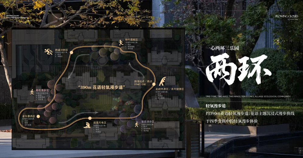 社区内部提出了“一心两轴双环十境”的聚气格局,通过约390米双环漫游系统串联起整个社区的功能空间。