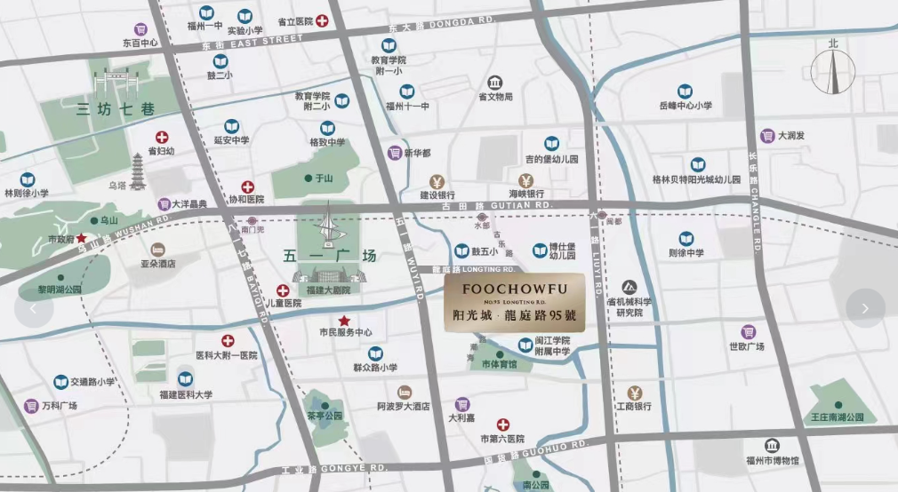 地处福州鼓楼区核心地段,龙庭路95号最大的优势就是不可复制的地理位置。这里是福州传统的政治、经济、文化中心,周边配套已完全成熟。