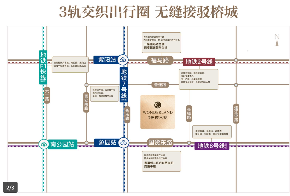 榕发·锦珹大观构建了“三轨交汇、三纵三横”的立体交通网络。已运营的地铁2号线紫阳站近在咫尺,规划中的7号线和8号线也将在此交汇,未来将形成真正意义上的地铁换乘枢纽。
