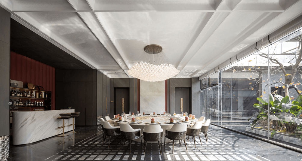 项目提取福州丝绸中的“二色金”元素,融入“鎏金玉珹”“城市冠冕”等装饰符号,于细节处精雕细琢。入口大门甄选昂贵的马达加斯加蓝翡翠奢石,镶嵌宫廷御用藻井片,尽显尊崇礼序。