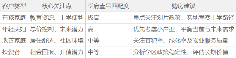 学府壹号特别适合两类家庭:一是将子女教育放在首位的年轻家庭,二是追求安静居住环境的改善型家庭。