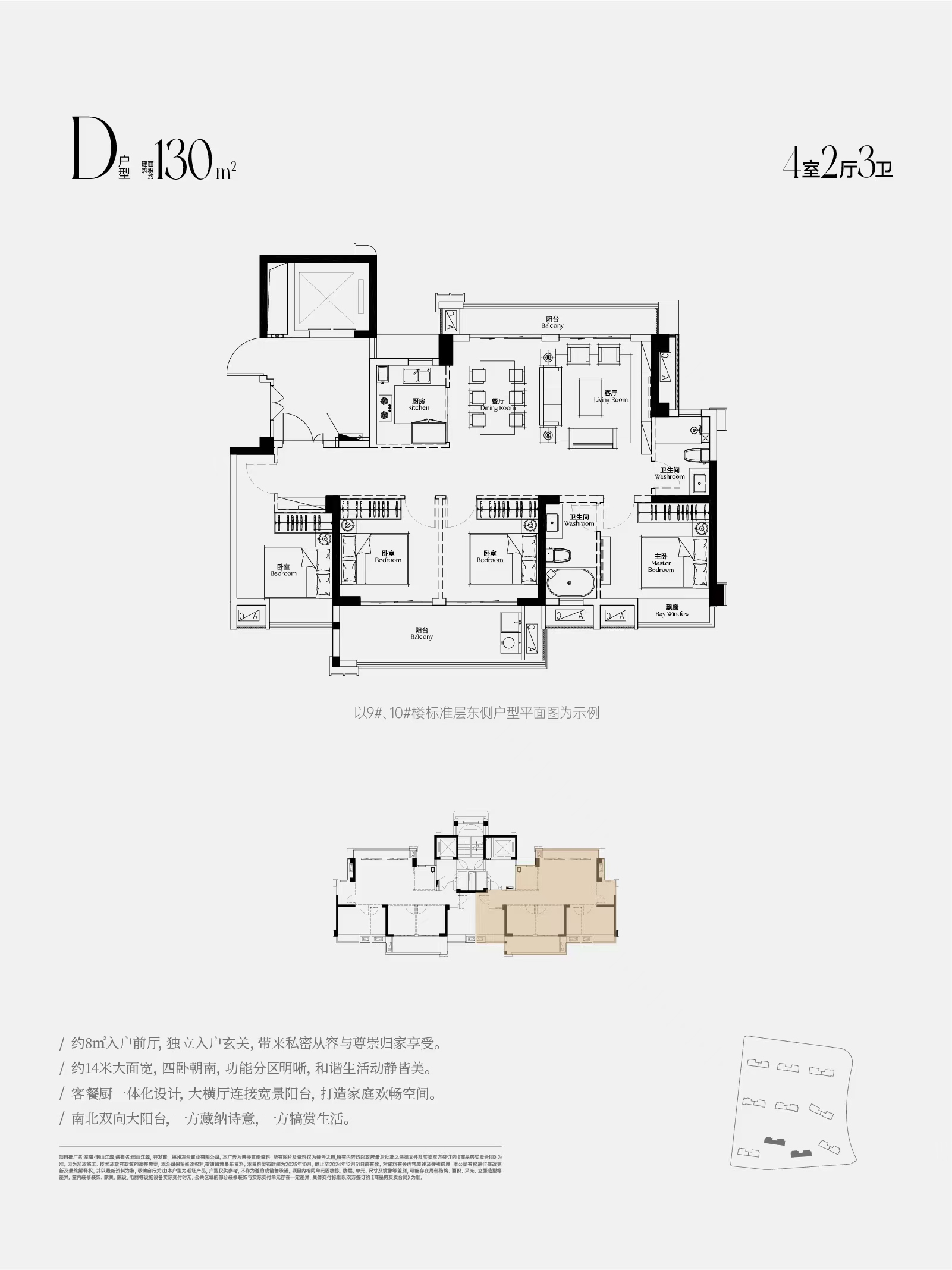 建面约130㎡:四开间朝南,南北双阳台,功能性与舒适度兼具。
