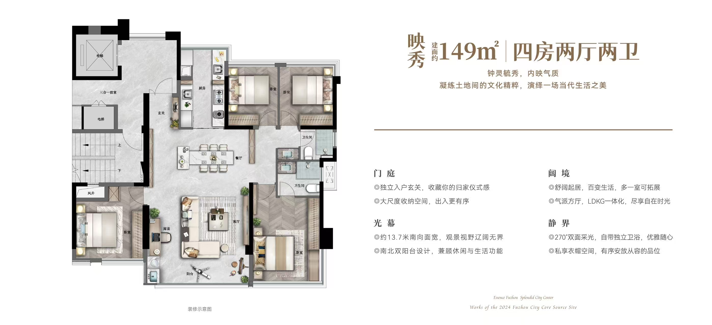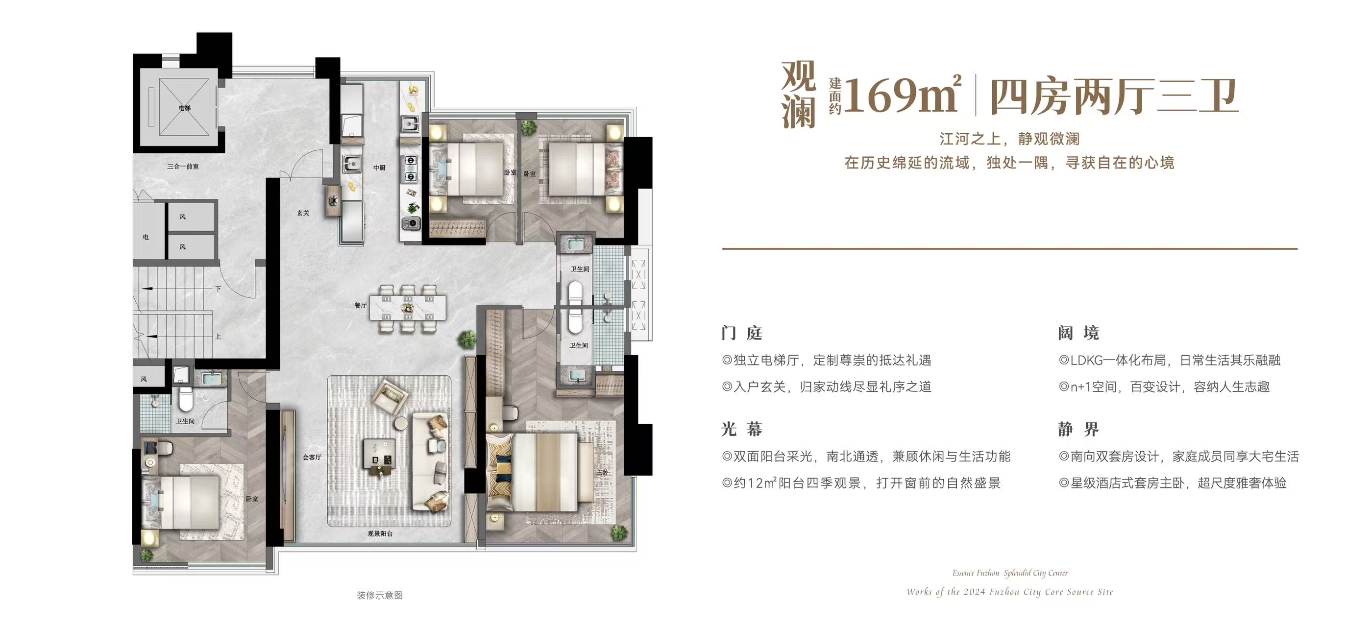 空间革命:户型设计普遍采用大面宽、短进深,得房率高达82%-90%。尤其是独梯独户的归家配置,让你踏入电梯厅的那一刻,便拥有了私密的“外玄关”。
