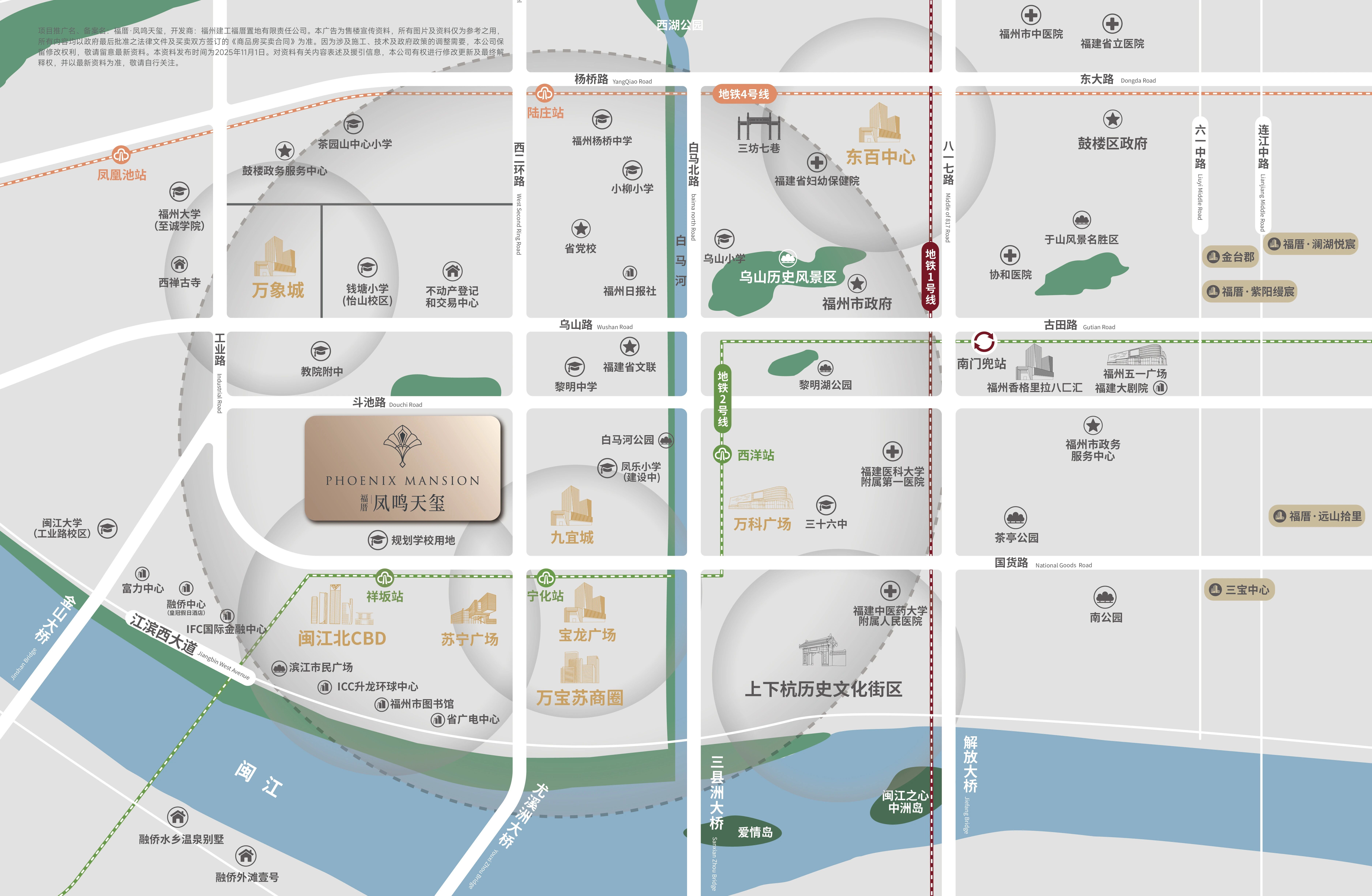 立体交通网络:距离地铁4号线凤凰池站约500米,地铁2号线祥坂站约700米,形成双地铁覆盖。西二环快速路与工业路构成十字动脉,实现10分钟车程贯通鼓楼、台江、仓山、晋安四区,通勤效率极高。