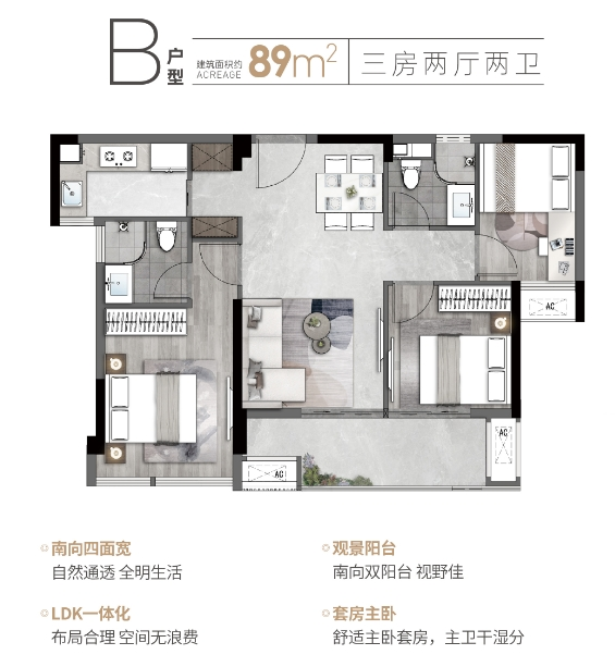 89㎡三房:主打南北通透和主卧套房设计,适合预算稍宽裕的三口之家。