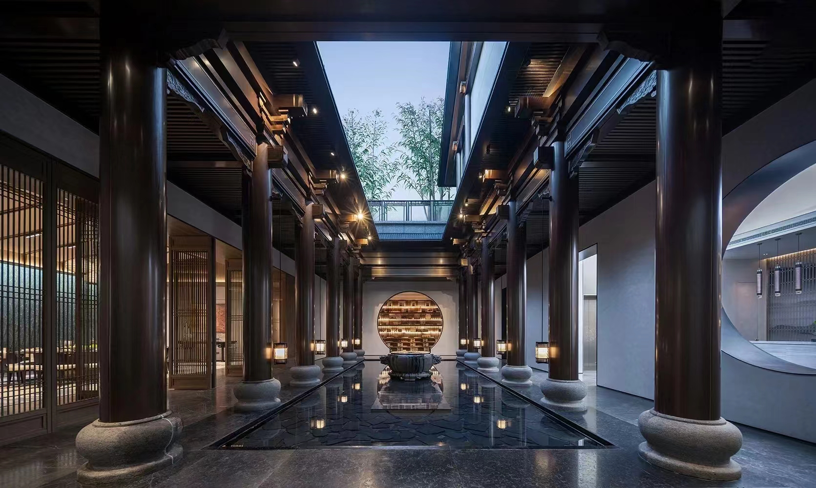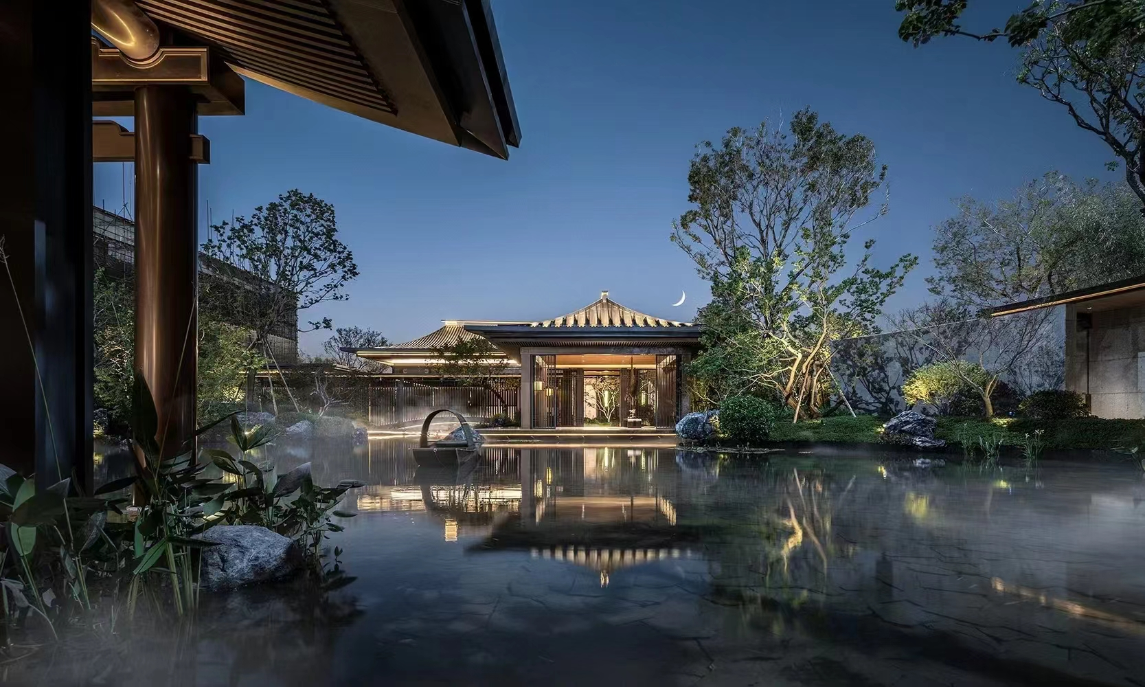 在外立面上,项目不惜成本,选用伊朗进口蓝眼睛石材,搭配双重飞檐与金属流线,营造出极具辨识度的“钻石级”质感。而在园林营造上,更是建发的看家本领——外拥皇家园林南公园,内揽江南园林“拙政园”之神韵,社区内保留的百年古榕,更是见证了城市的变迁。