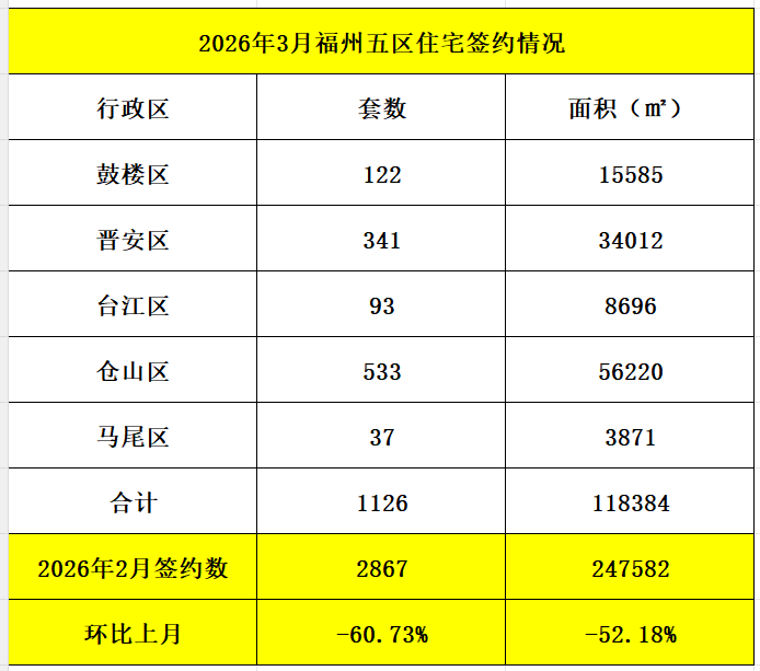 根据福州房地产网统计,2026年3月福州五区住宅签约1126套,签约面积约11.8万㎡。从区域分布看,仓山区以533套位居榜首,晋安区341套紧随其后,鼓楼区122套,台江区93套,马尾区37套。
