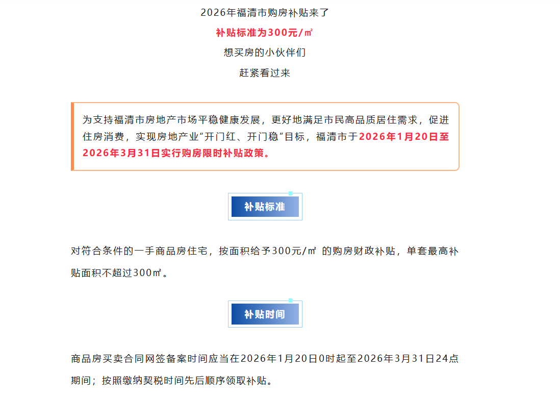 2026年初,国家层面密集出台房地产利好政策,包括房贷利率双降、首付比例下调至最低15%、交易税费减免等。福州本地也同步优化信贷政策,降低购房门槛。特别是福清市推出的购房补贴政策(300元/平方米,单套最高9万元),直接推动了该区域4751套的惊人成交量。