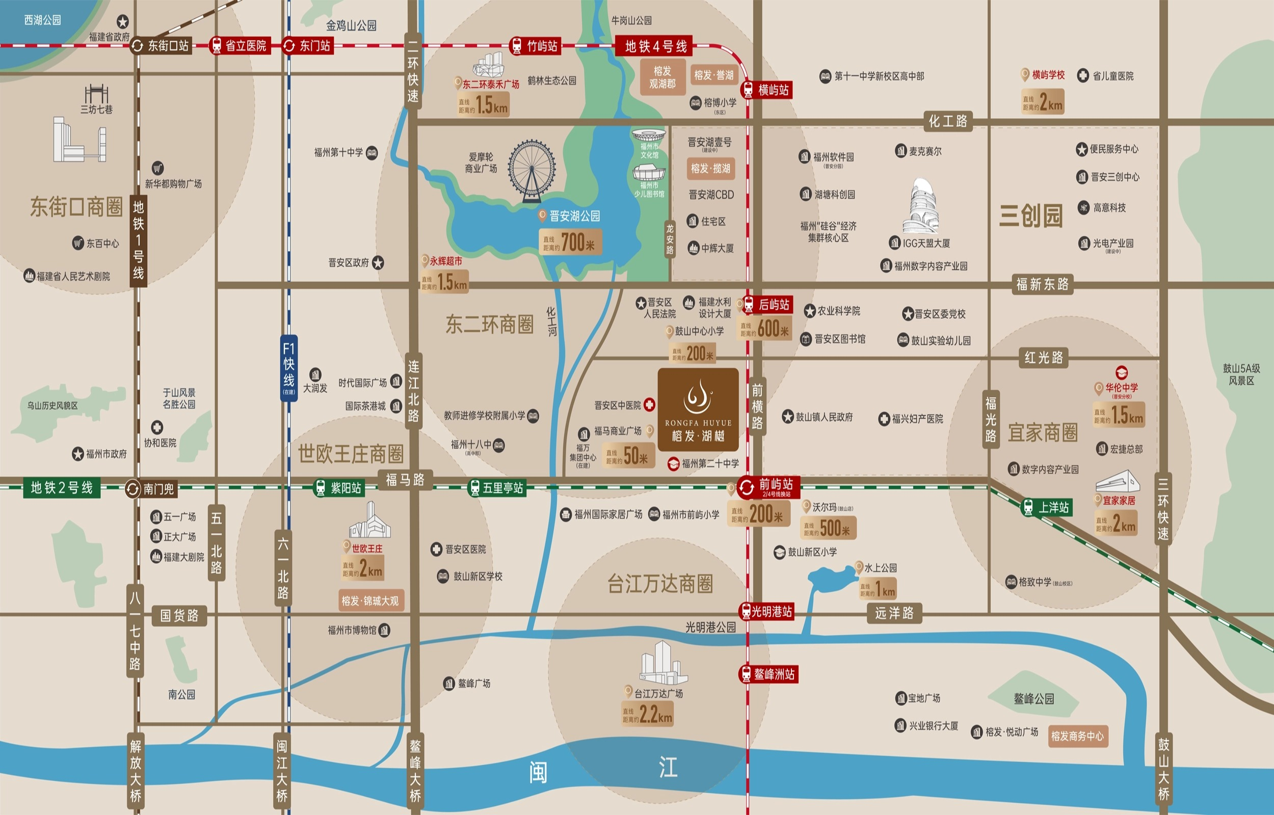 榕发·湖樾的最大亮点在于其不可复制的地理位置。项目直距晋安湖仅约700米,业主可轻松步行至约680亩的晋安湖公园,享受稀缺的城市湖景生态资源。交通上,它具备真正的“双轨地铁房”属性,距离已通车的地铁2号线与在建的4号线交汇的前屿站仅约200-320米。从这里出发,1站直达宜家,2站到世欧王庄或台江万达,3站到东泰禾,5站直达东街口,实现了真正的全城快速通勤。